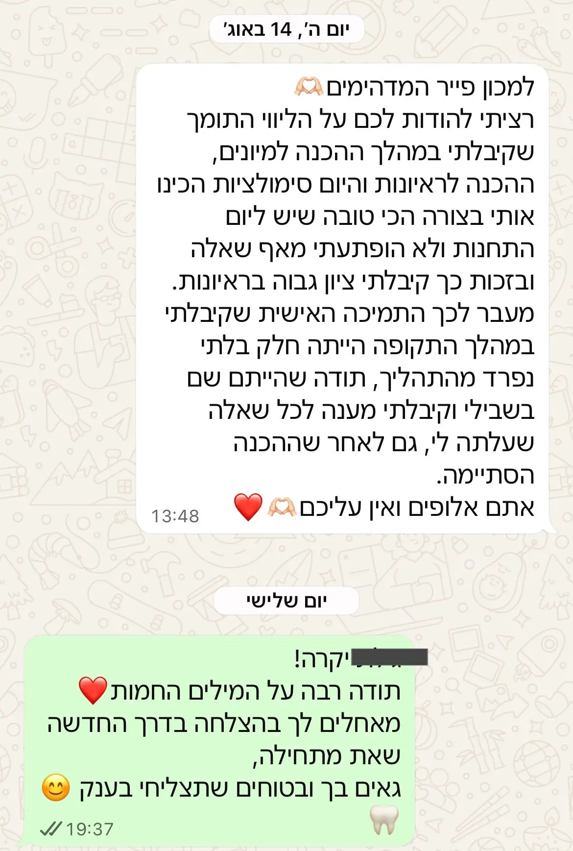 אכפת לנו ממך! פשוט ככה. כל הצוות של פייר מורכב מסטודנטים לרפואת שיניים ורופאי שיניים שהיו בדיוק איפה שאתם. אנחנו יודעים כמה התאמצת ועד כמה חשוב לך להגשים את החלום ולכן , אנחנו כאן בפייר לדאוג שהוא יקרה. אנחנו רואים אותנו כצוות ביחד איתכם ומביאים את הנסיון שלנו בכדי להפוך את עצמכם לגרסא הטובה ביותר של עצמכם כזו שתדע לדבר ביום הראיונות שלך בצורה הכי קולחת , אוטנתית ומדויקת.